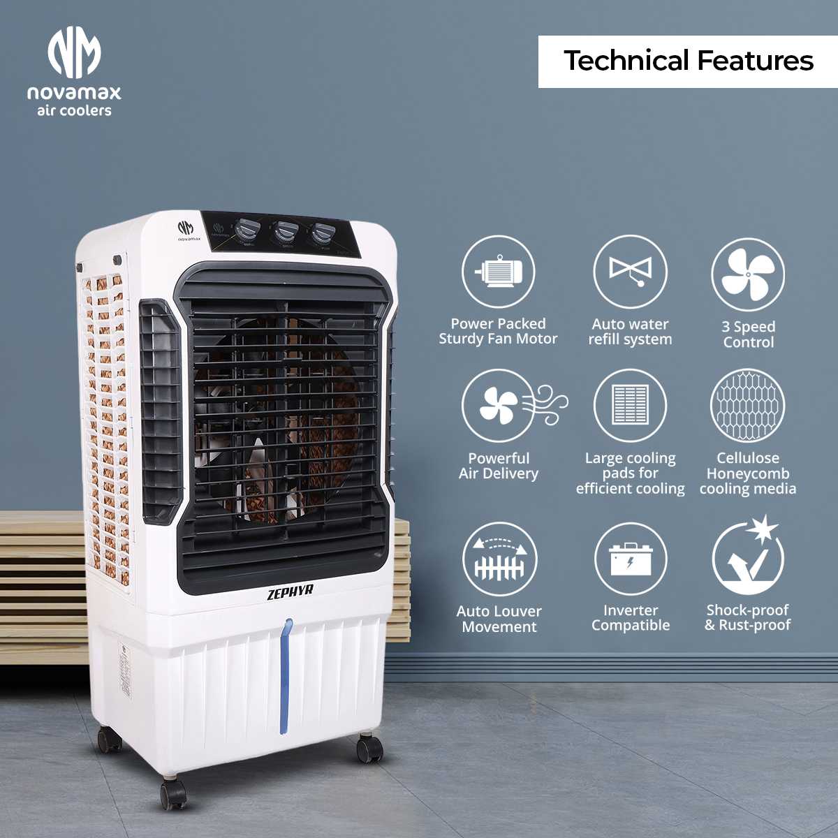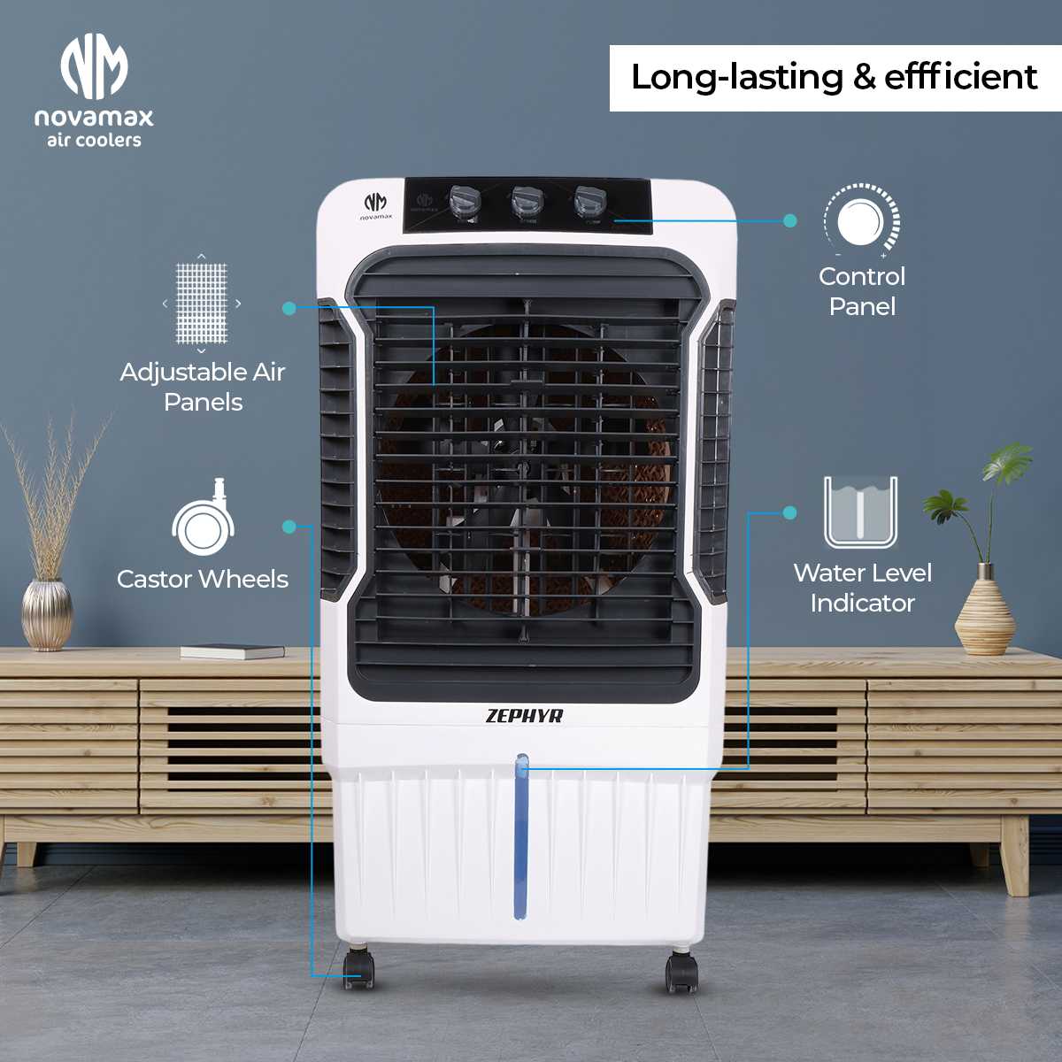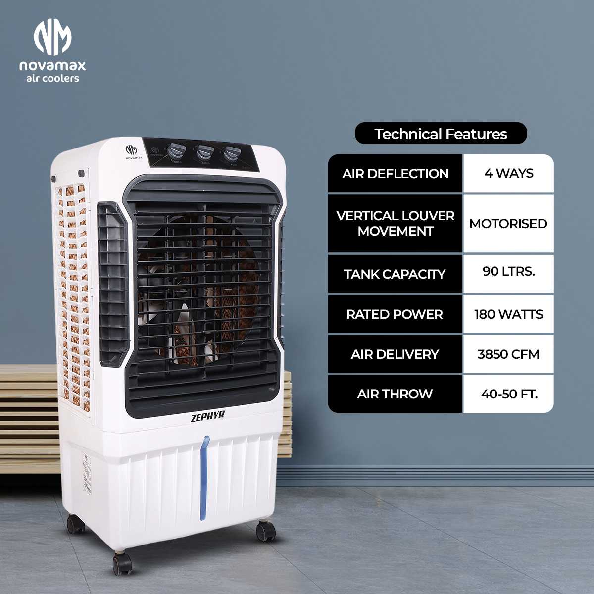 The Zephyr 90L Desert Air Cooler is the best air cooler for home, offering powerful cooling, high airflow, energy efficiency, and a large 90L water tank for extended operation.